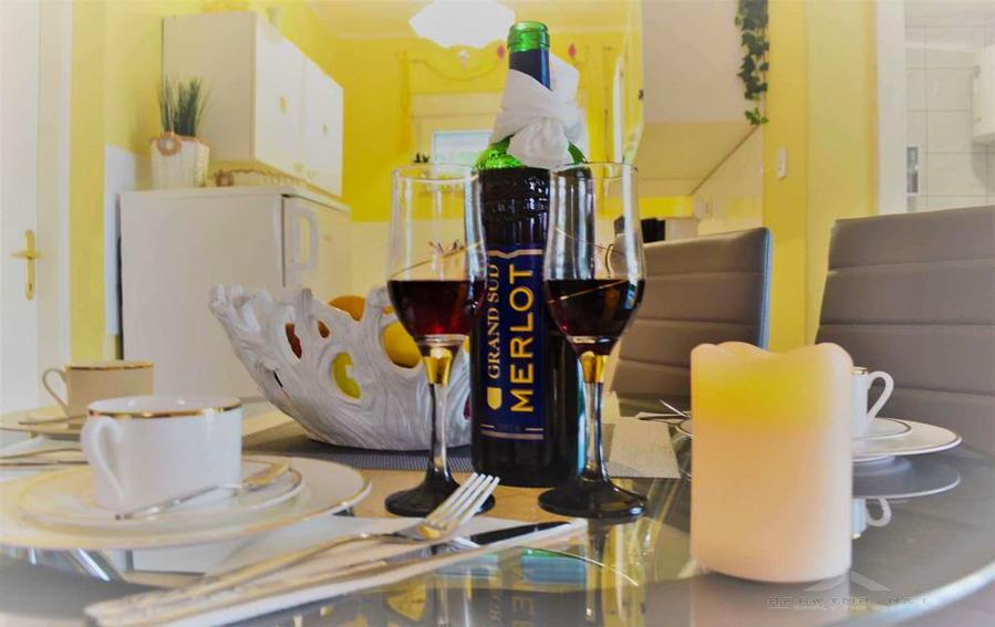 Apartment Relaxing apartment is located on the ground floor, guests have a private balcony next available full fenced yard, terrace and parking in front of the apartment with external barbecue and picnic area, all the more beautiful green garden and shade trees. The apartment has two spacious bedrooms with beds for two persons and a living room where extra bed is for two guests. The kitchen is new, comfortable, equipped with all appliances, large fridge with freezer, induction hob cooking utensils and dishwasher. In the bathroom you will find in addition to showers washing machine. The apartment is air conditioned and has enabled wireless Internet access . At your disposal it is also a new large LCD TV.